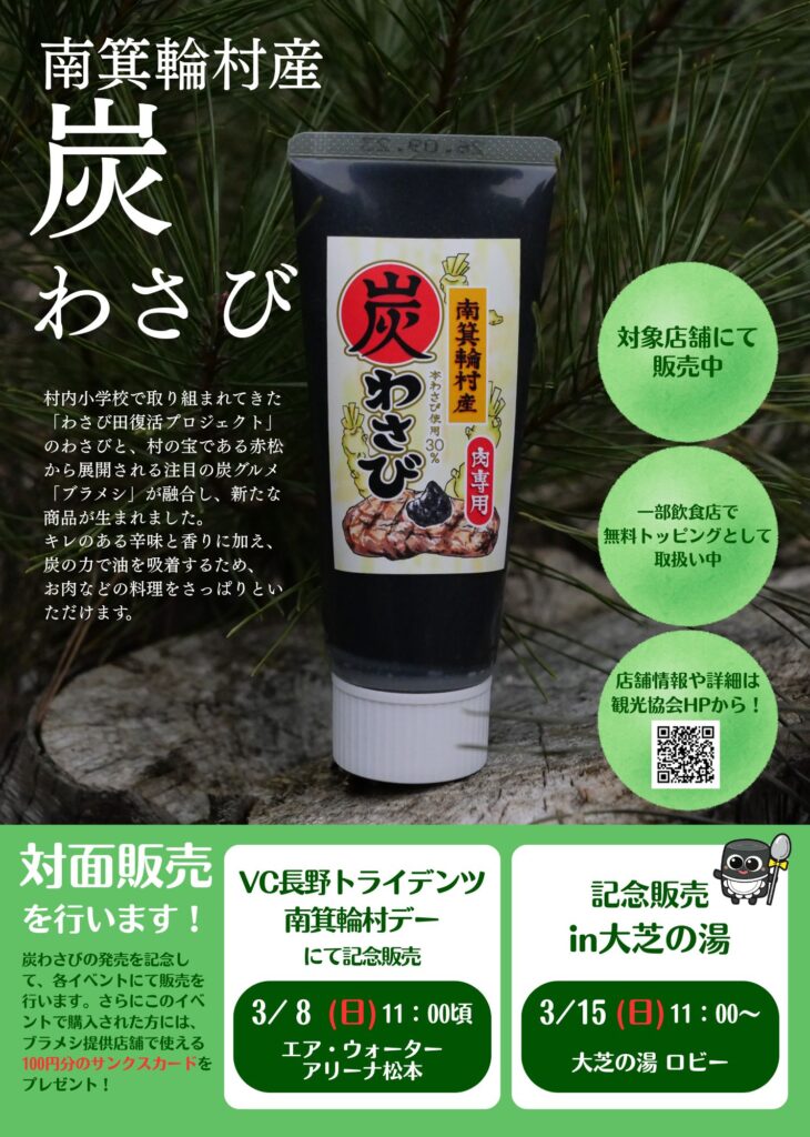 - 景品: 炭わさび(特別パッケージ/非売品)、炭スイーツ、大芝の湯入浴券など。
